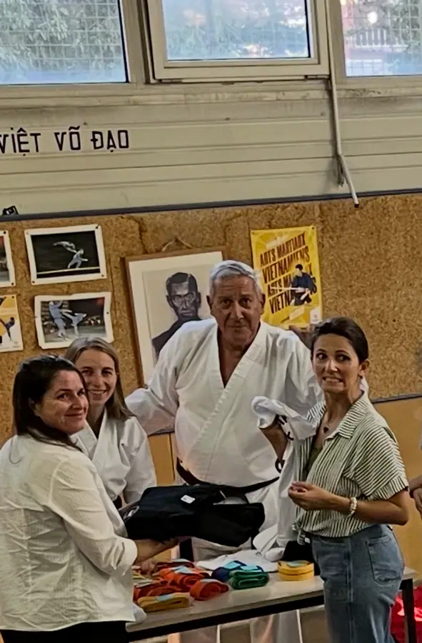 Michel et Thierry ont ainsi reçu leur grade de 3ᵉ dan, tandis que Flora et Marie ont été officiellement élevées au rang de ceinture noire 1er dan, récompensant les années de travail, de persévérance et d’investissement.